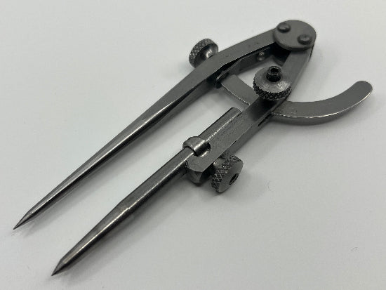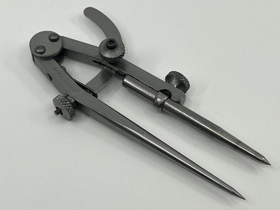 An unusual no longer available model of C.S. Osborne Divider. This divider features independently pivoting legs ( each leg has its own pivot point instead of both legs sharing one as is usual, only one seems to move when I have checked how wide it opens though...it probably needs a drop of oil). It also has a removable point the can be replaced with a common pencil. There is a fine adjust feature for accurate setting or measuring applications. Made entirely in the US of high quality steel, hardened and ground. A beautiful tool. Came with a large tool collection and appears to have little use. There are 10 or 20 light marks on the bow from use otherwise excellent. The legs open to approximately 5-7/8".
