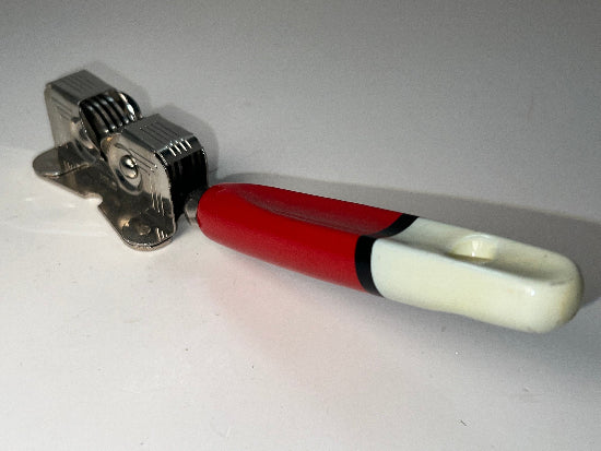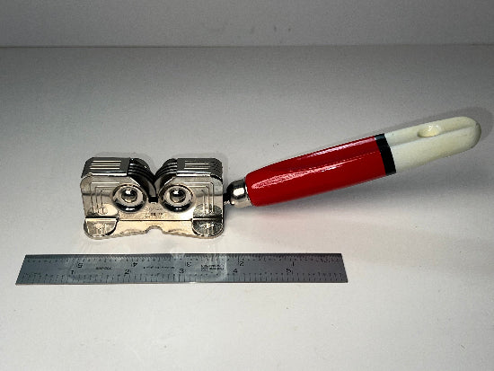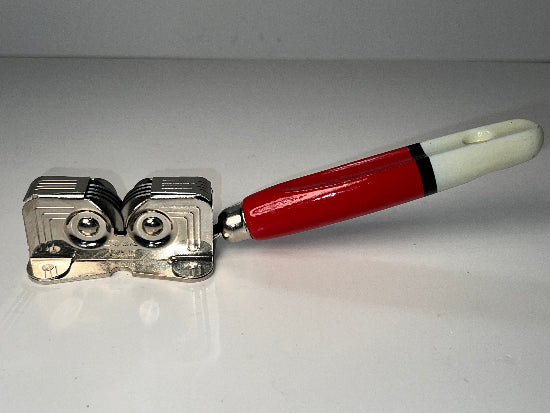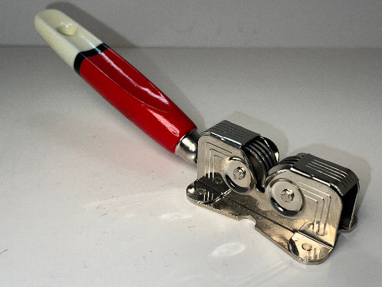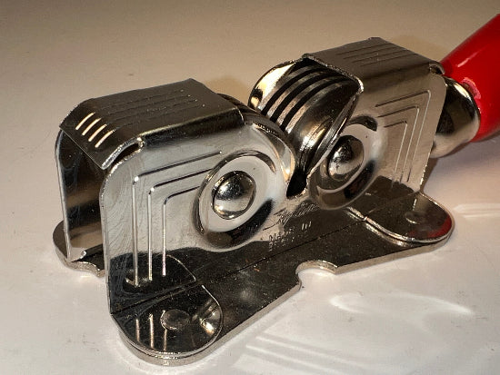 New Old Stock 1960s SKYLINE Knife Sharpener made in Burnley England. These iconic sharpeners were made from 1940s until the 1970s. They are a Mid Century Modern Classic . They feature a beautifully painted wooden handle and a high polish chrome finish on the metal body. In use one hand holds the handle of the knife sharpener  and the other pulls the knife blade through the twin rows of wheels. The wheels have been ground to a sharp edge . This action scrapes away a minute amount of steel and leaves a sharp edge. This was suitable for knives made back in the 1960's but would not be suitable for current knives ... especially Japanese Knives ! These items are being sold as a collectable only ... not for use.