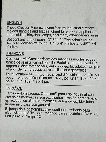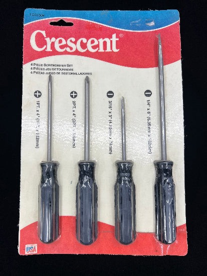 New Old Stock CRESCENT USA Made 4pc Screwdriver SET 2-SLOTTED AND 2-PHILLIPS. This old stock set was made in the 1980s and features #1 and #2 Phillips plus 2 sizes of Slotted Screwdrivers.