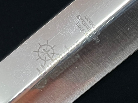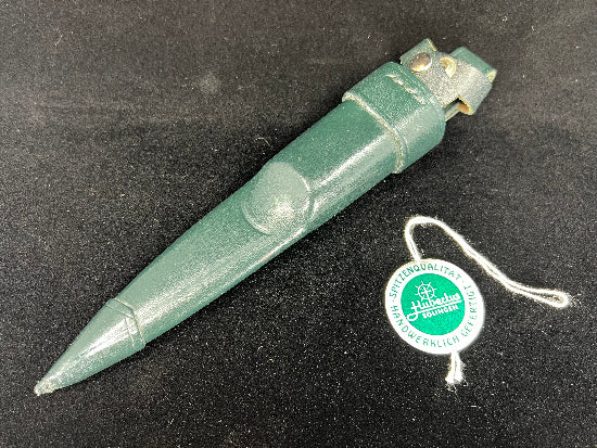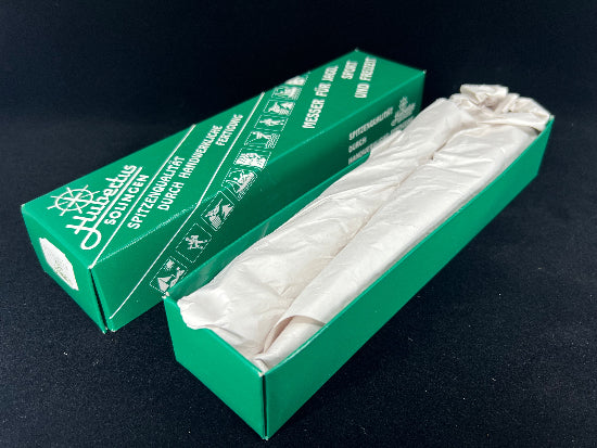 HUBERTUS pig stickers ( this name was given as they were traditionally used during the hunt for wild boars to dispatch a wounded animals) are equipped with a Swing guard of solid nickel silver which is placed aside to the handle when the blade is closed. While folding the blade to open position the guard swivels in front of the handle. A safety lever is used to lock or unlock the blade. All fittings are made out of solid nickel silver. This style of knife has been made for more than 100 years in Germany. A very beautiful knife made by one of Germany's premier makers. Not often found on this side of the pond!
