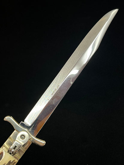 New Old Stock HUBERTUS Germany "Pigsticker" Folding Swing Guard Bowie Knife with Stag Handles.