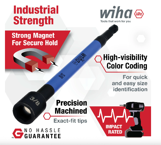 Wiha's color coded nut setters are designed with high-visibility color-coding and laser-engraved size callouts for quick and easy identification. The nut setters have a solid shaft to provide strength and durability for long-lasting repetitive use. Wiha color coded nut setters are impact-rated for use in power tools. The nut setters feature industrial-strength magnets that securely retain fasteners to give you the freedom of one-handed work applications. 6-inch long magnetic nut setters come with a standard 1/4-inch hex drive making it easy to work in limited access environments. The set includes standard SAE sizes: 1/4-inch, 5/16-inch, 3/8-inch, 7/16-inch, 1/2, and 9/16-inch for a wide variety of applications. Wiha nut setters are built for a long duration. Color coded nut setters are made of premium quality CrMo tool steel and have a durable finish for corrosion protection. Nut setters are precision-formed for exact-fit to reduce fastener cam-out that can lead to injury or damage to finished materials. The socket openings feature a beveled rim for easy fastener engagement with a broached and smooth finish for prolonged life.