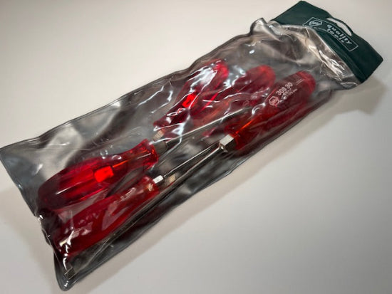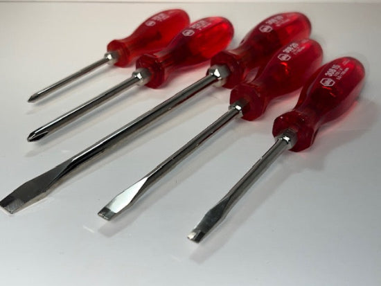New Old Stock WIHA WEST- GERMANY 5pc SLOT & PHILLIPS Screwdriver Set c/w CHERRY Red Acetate Handles. This rare screwdriver set features Wiha's beloved cult classic Cherry Red Acetate handles. They are super comfortable and almost indestructible. The blades are made of premium grade tool steel and have a round shank with a large HEX where the blade  meets the handle so a wrench can be applied for extra torque. The THREE slot blade screwdrivers feature Sharpe micro-serrations on the Tips that will grab and bite into the slot of the screw head and prevent cam-out. This feature was usually only found on WIHA's gun smithing screwdrivers and is very sought after. Premium quality RARE West German Screwdrivers!