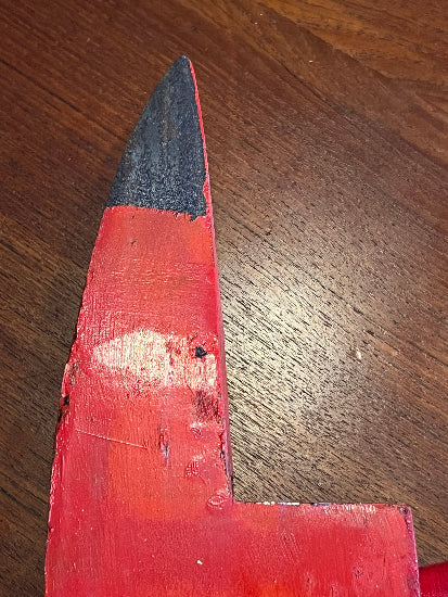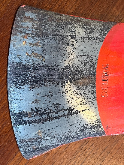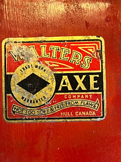 This axe was packed in a crate in the 1960's and only taken out of the crate and unwrapped for the photos. The axe was made by Walters , the famous Canadian maker of premium quality Axes . As I have shown the head was still wrapped in cardboard and brown paper. I had to cut the brown gummed paper tape. The head has some oxidation from being in contact with the cardboard all these decades and on he back side of the head an area of the paint has rippled/bubbled from being in contact with the cardboard. The Axe head is still very beautiful and could be cleaned up if desired . The head has a very nice paper label on it that has wonderful colors. The head and handle both appear to be painted with a red enamel paint . The handle is beautiful and has a lovely gold colored logo on it that I have shown in a close up photo. The axe head is ground to a very fine edge and is still very sharp. The axe measures approximately 35" overall. There are small scuffs ,marks and dings from storage and manufacturing. A very beautiful tool that is really a time capsule into Canadian manufacturing !