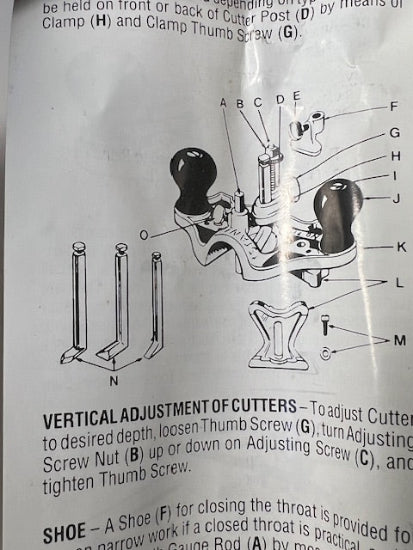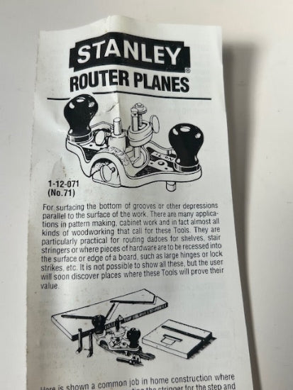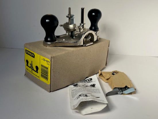 From the collection of an avid Plane collector is one never used Stanley Router Plane No. 71 complete and new in the box. Included is the plane with blade and fence installed as well as depth rod and shoe ( I think that is what it is called) . In the box is a paper package that includes 5 more blades. The 2 blades that have removable cutters have some light rust on them the others are all perfect and new. Original paperwork is included but has been crumpled. The blades have never been sharpened. The plane has been assembled but has never cut wood. It is perfect as far as I can see. The box has a tear in the top and has a part number written in ball point pen, it also has a date stamped on its end 23 NOV 1999. It has the original yellow and black paper label marked Stanley Tools Sheffield England 12-071 ( 71) . The body of the tool is marked Made in England. A very beautiful tool !