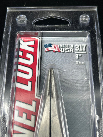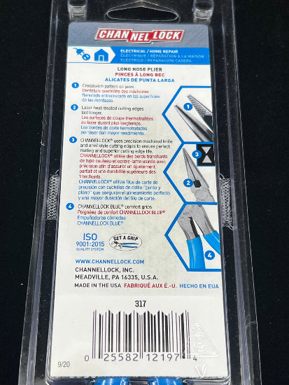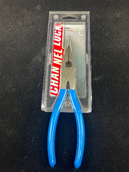 Channellock USA No. 317 8" Long Nose Pliers with Side Cutter. Extra long needle nose jaws for hard to reach spots.
