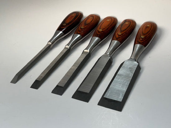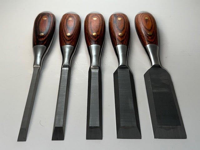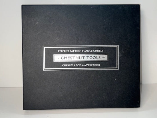 Never Used Chestnut Tools ( Chestnut Tools was a division of Lee Valley that produced a varied line of tools) Perfect Pattern Bevel Edge Chisel Set. This unusual set of chisels comes complete and new in the original box, these lovely tools were sold by Lee Valley about 10 or 12 years ago, and are no longer available. Includes the following 1/4", 3/8", 1/2", 3/4", & 1" widths. All feature solid steel construction with wood scales riveted to either side to form the handle. They have a very solid feel and are beautifully machined with wonderfully comfortable handles. A hard to find set !